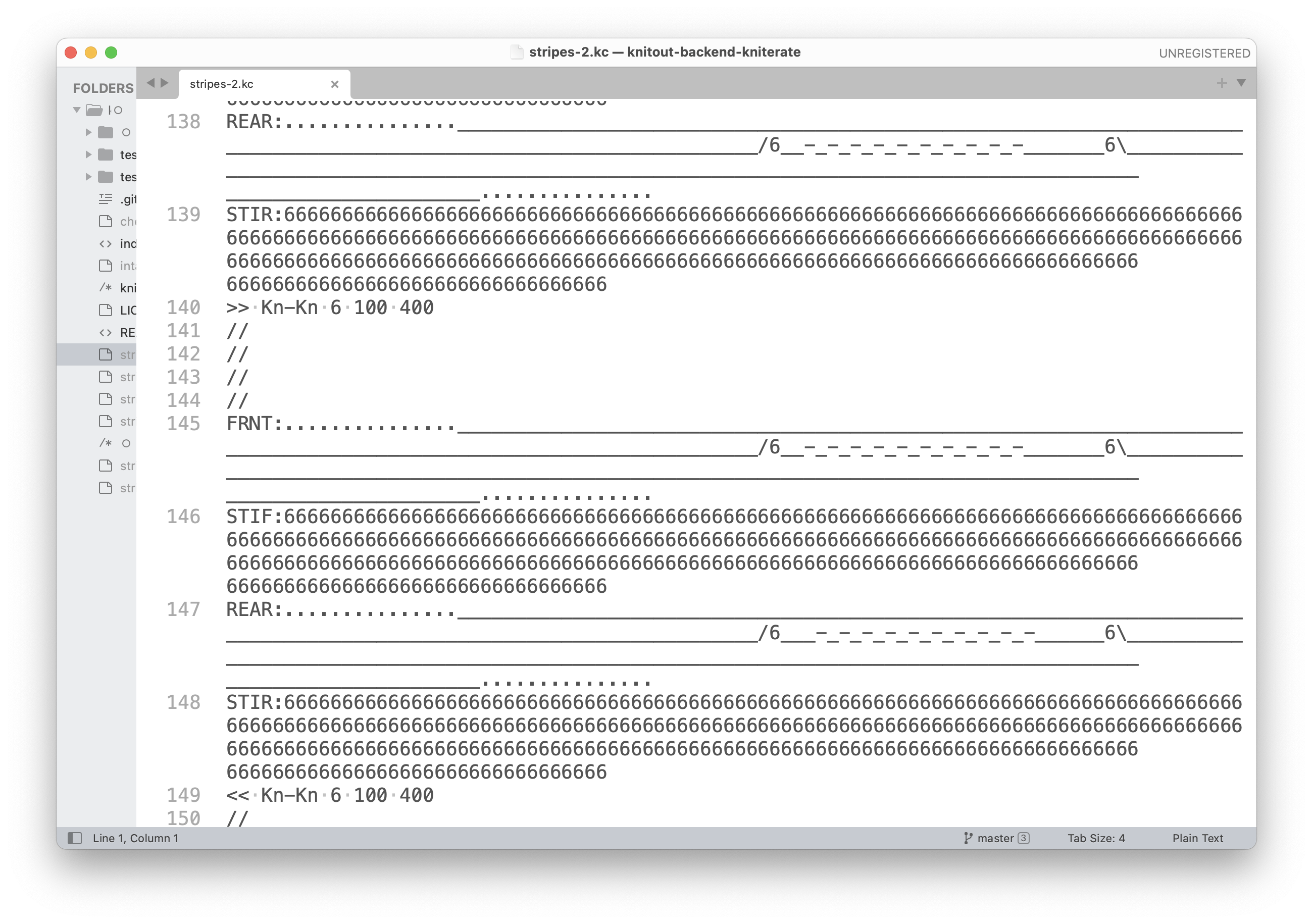 In order to adapt this for the machine, we then use some of the backend tools. First, we use the knitout-alter-kniterate file, from the knitout-kniterate backend extras folder, to take the original knitout file and adapt it for the kniterate. (input: stripes-example.k