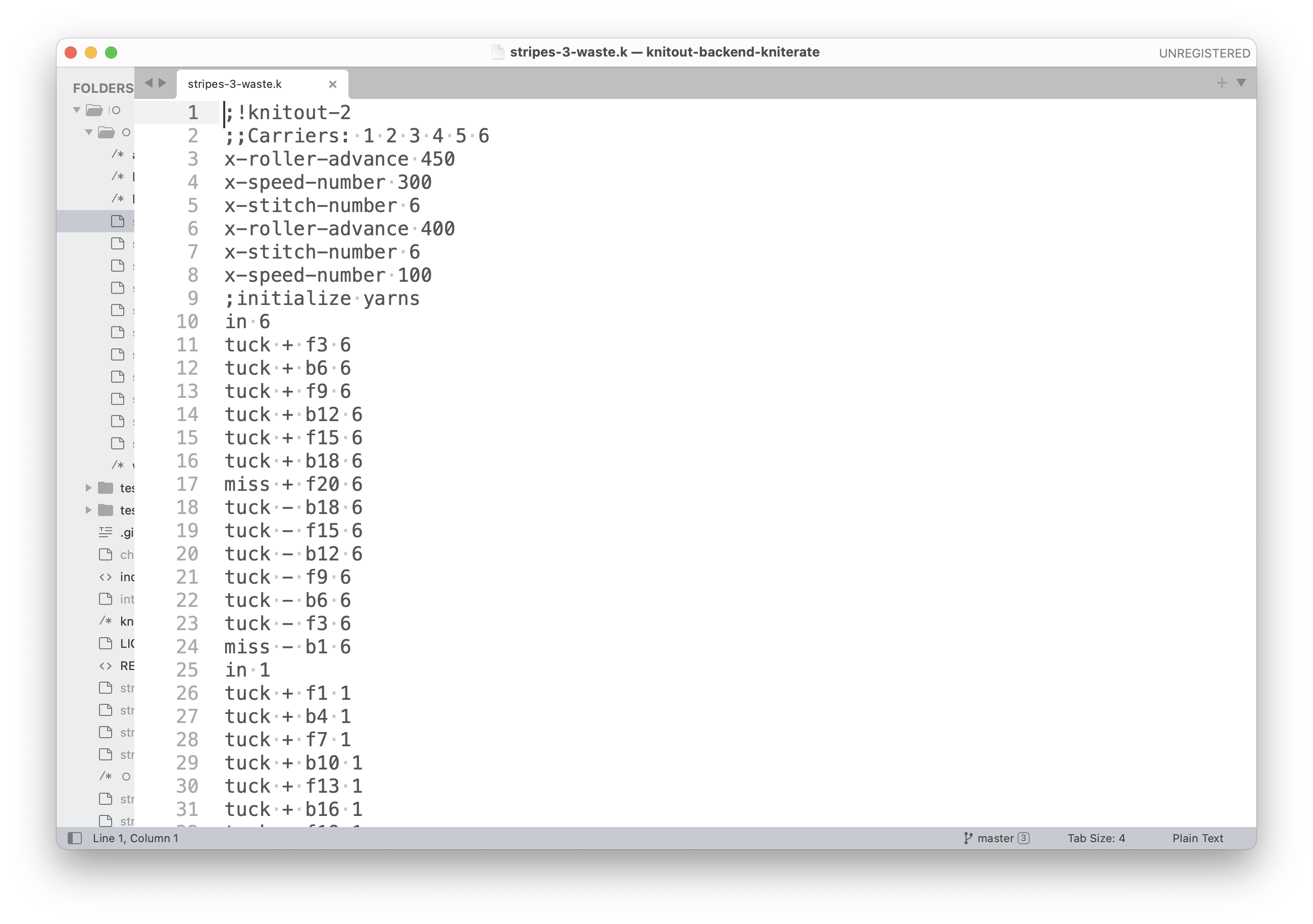 node knitout-to-kcode.js extras/stripes-example-kniterate-waste.k stripes.kc