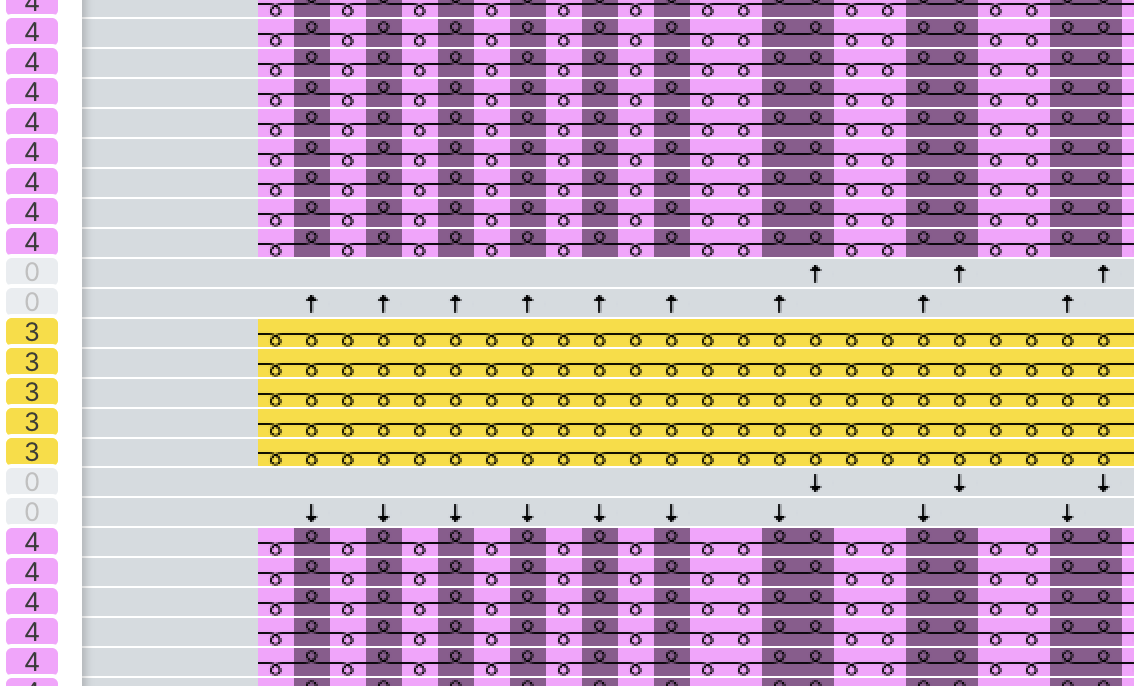 a section of the rib sample in the kniterate software, showing transfers between beds at the start and end of the rib section. You can see transfers from the (dark) back bed to the (light) front bed indicated by a down-pointing arrow in the rows before the yarn 3 section, and the up arrows indicating where stitches are transferred to the back bed for the next rows of rib. Notice that where there are multiple adjacent transfers this takes place over 2 rows.