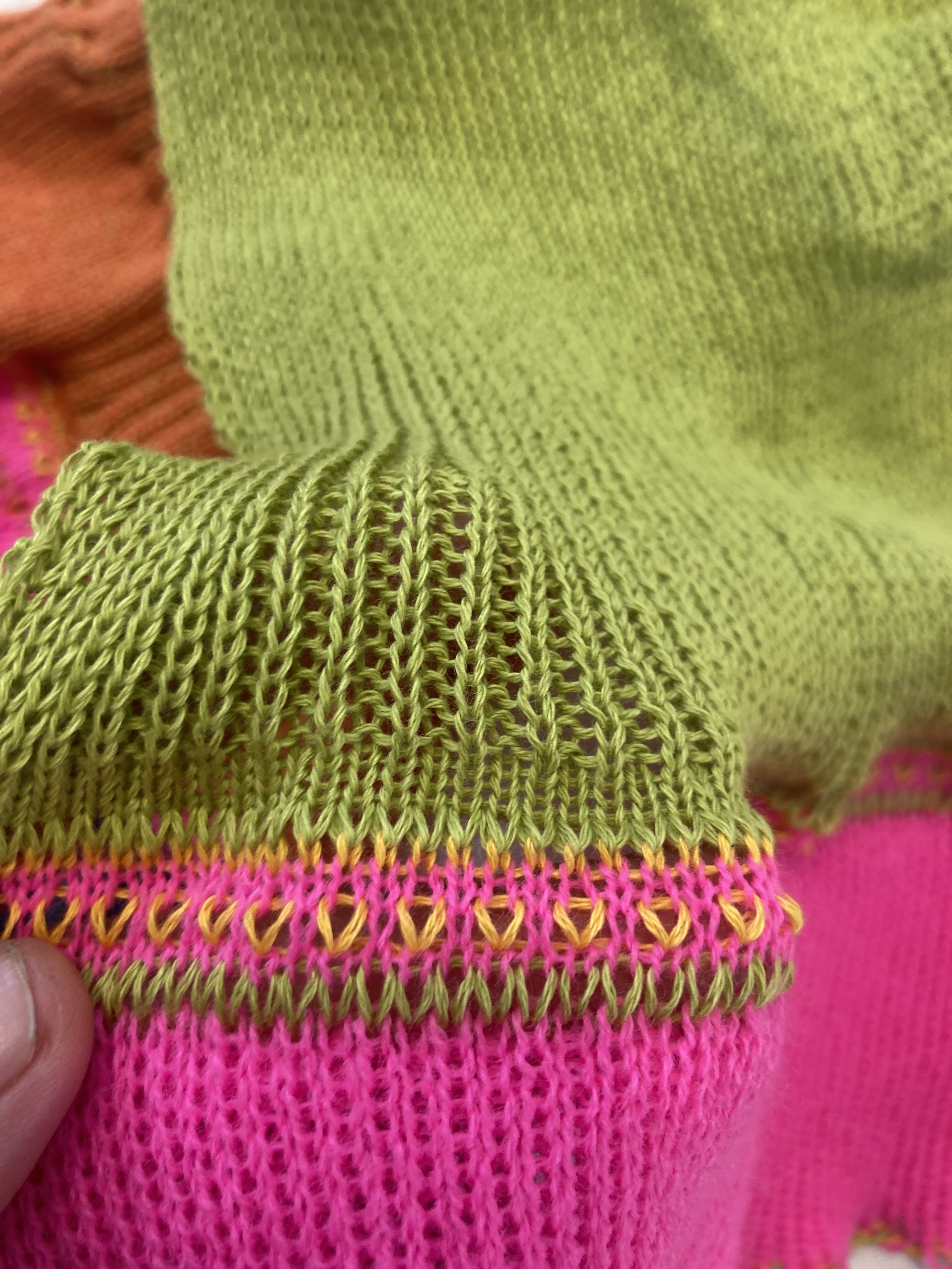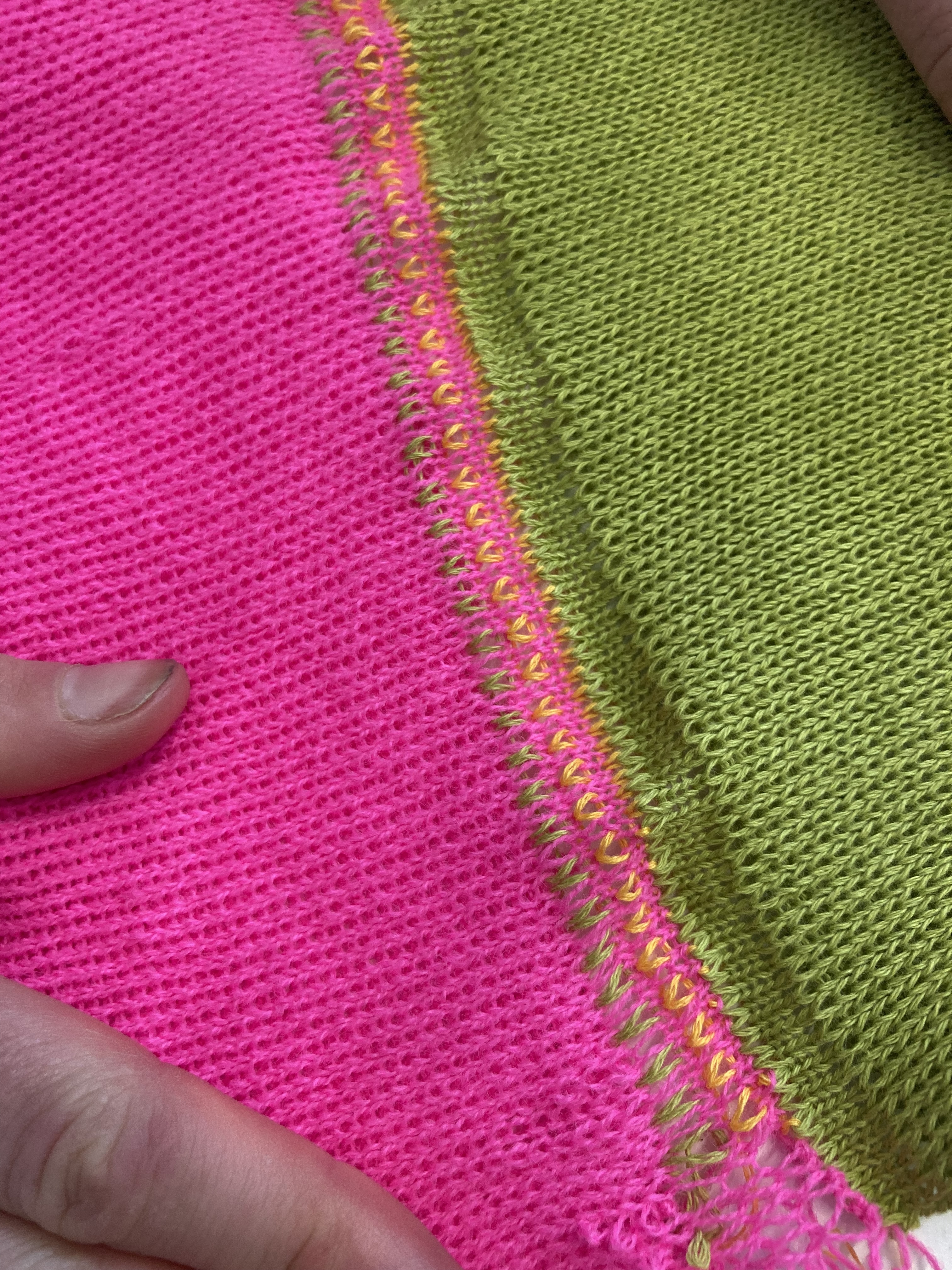 the bindoff test sample knit using the original code -- note how the shima-style holds leave some loose stitches on the edge