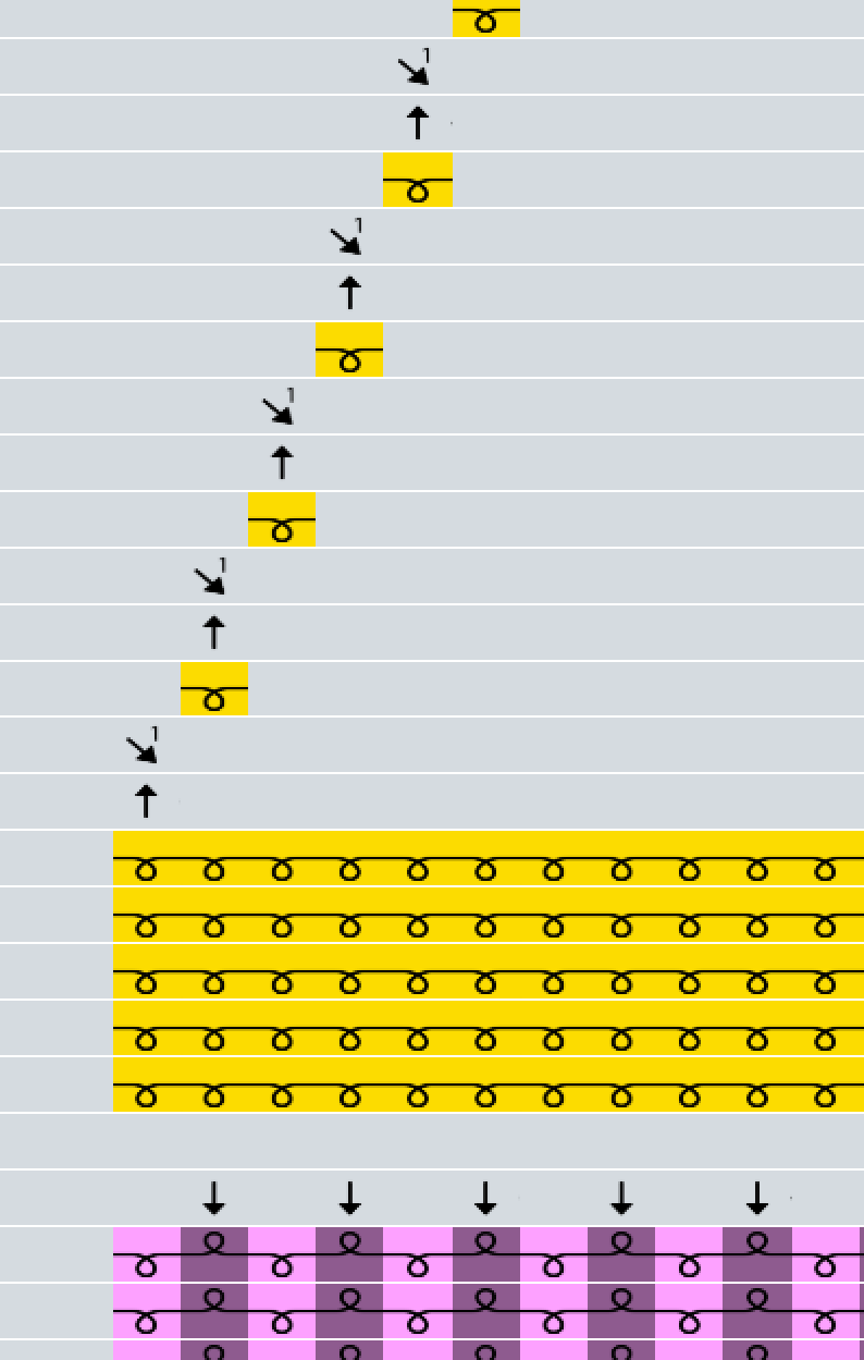 what the first bindoff section looks like in the knitout visualiser. Note the ‘held’ stitches every other stitch on the back bed!
