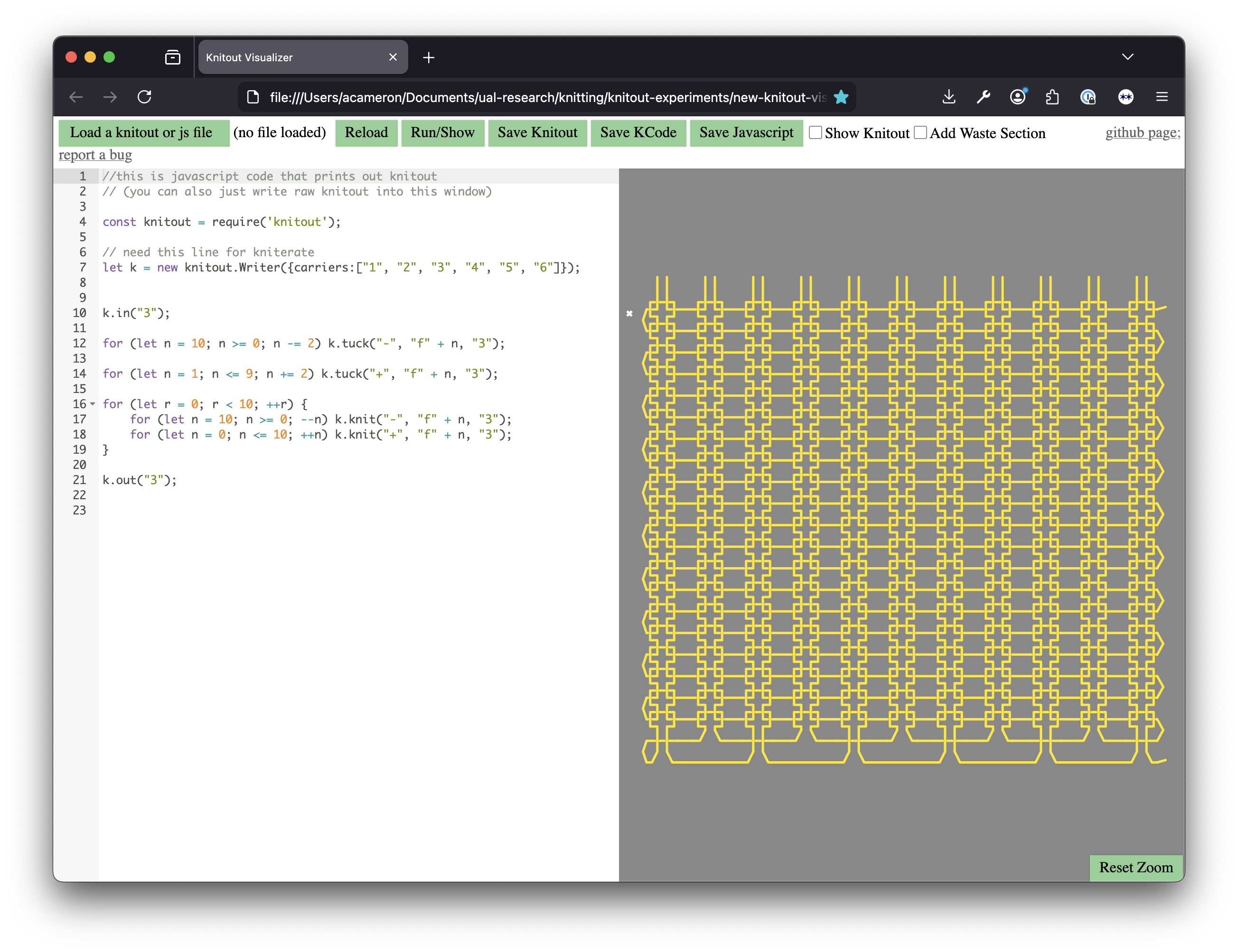 The next thing to test was casting off (after B spent about 20 minutes manually casting off the first sample). Initially, I used the rectangle-bindoff code from (in the US, ‘casting off’ = ‘binding off’) from the knitout examples repo, adapting it to the more recent version of the knitout-frontend javascript code as follows: